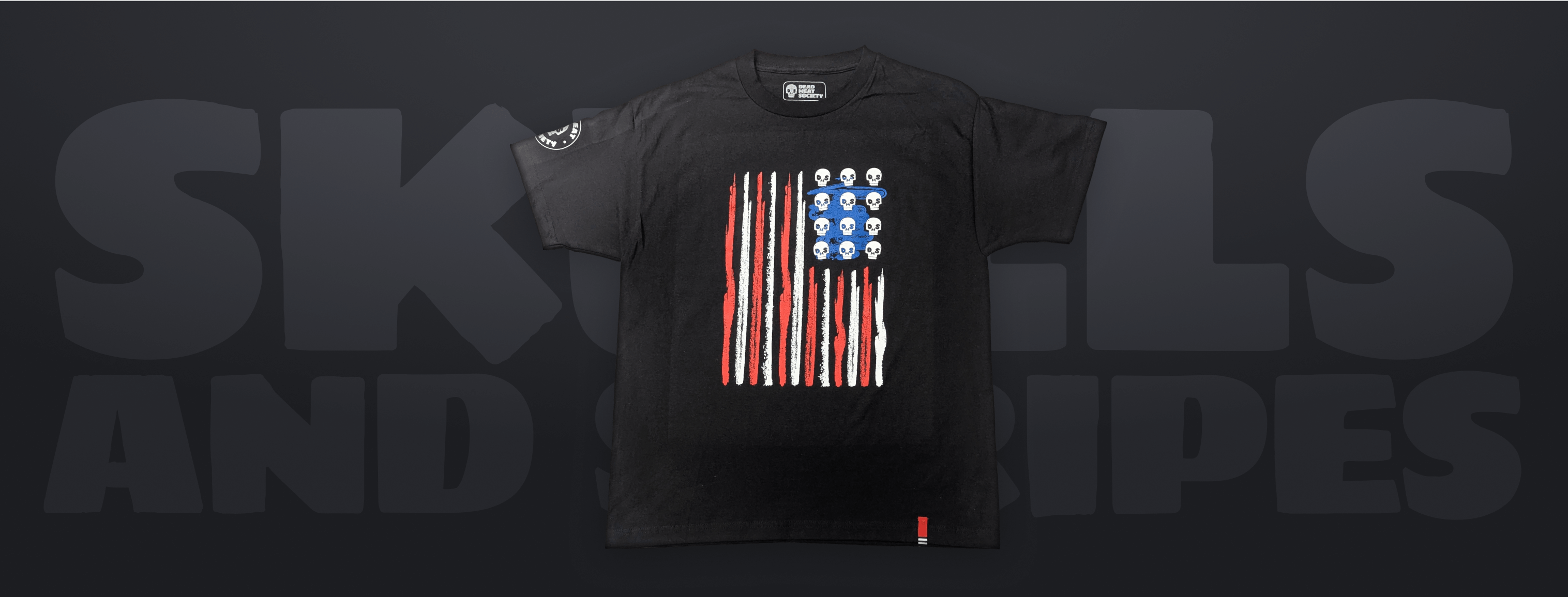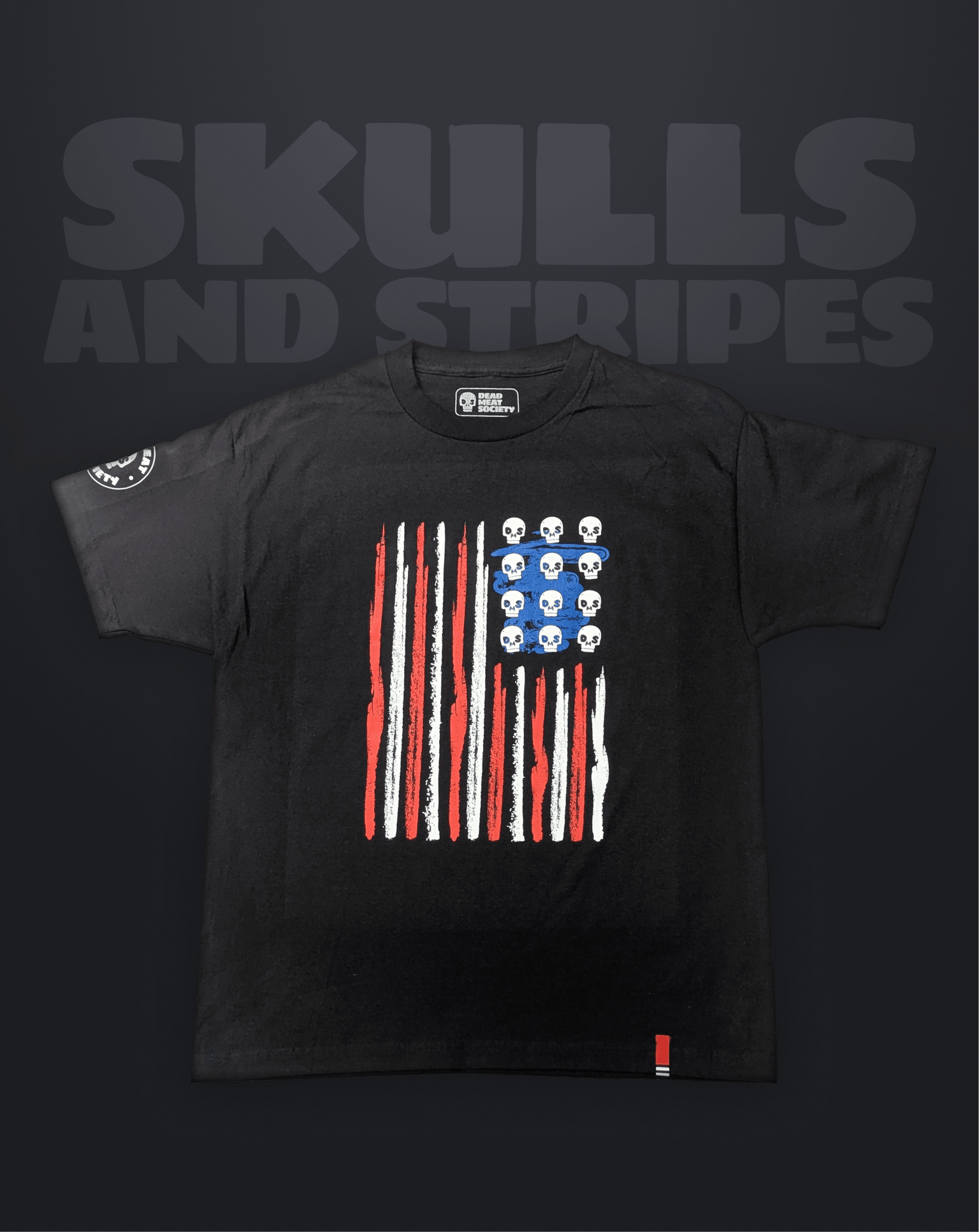 Bold. Patriotic. Undeniably Dead Meat Society. The Skulls and Stripes Tee throws down a gritty tribute to the red, white, and blue—with a twist. A total of thirteen skulls on this shirt stand tall for the original colonies, reimagined in our signature style with fire-soaked red stripes, charred black, and bone-white grit. One skull even marks your sleeve—because this isn’t just a shirt, it’s a symbol.